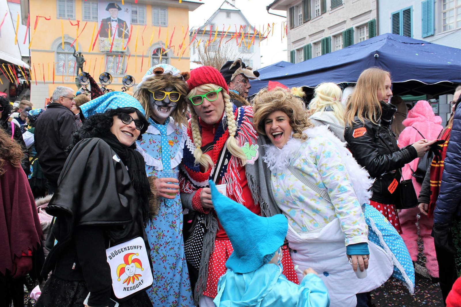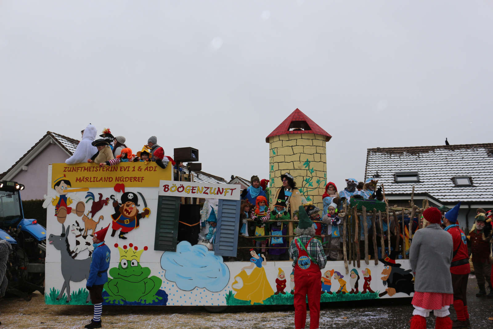 Was war das nur für eine Fasnacht im Märliland Nüderef. Zunftmeisterin Evi 1. mit Gatte Adi Niederberger, das Weibelpaar Kerstin und Jürgen Münkel sowie die ganze 70-köpfige Böögenzunft Nüderef gaben vom Schmudo bis zur Uslompete Alles! Man präsentierte sich als wilder Haufen aus dem Märliland. Seien es Zwerge, Prinzessinen, Wölfe oder Rotkäppchen, kaum ein Sujet aus dem Märliland war nicht vertreten.