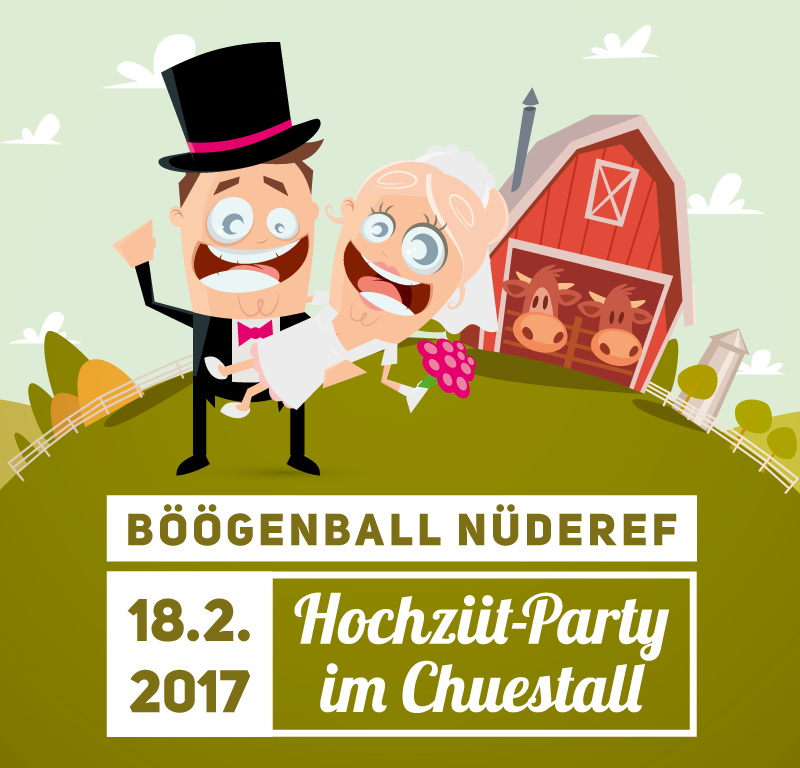 Auf unserem Hof sind nun seit 10 Jahren keine Kühe und Schweine mehr, dafür geniessen viele Hochzeitspaare ihren Apéro in unserem Kuhstall. Wir freuen uns an der Fasnacht 2017 unter dem Motto «Hochziit-Party im Chuestall» viele Hochzeitspaare, Hochzeitsgäste, Kaminfeger, Bauernhoftiere, Knechte und Mägde oder sonstige Unikate anzutreffen. In Anlehnung an meinen «grünen Beruf» wird die Farbe Grün, die Böögenzunft wie ein «roter Faden» durch die Fasnacht 2017 begleiten.